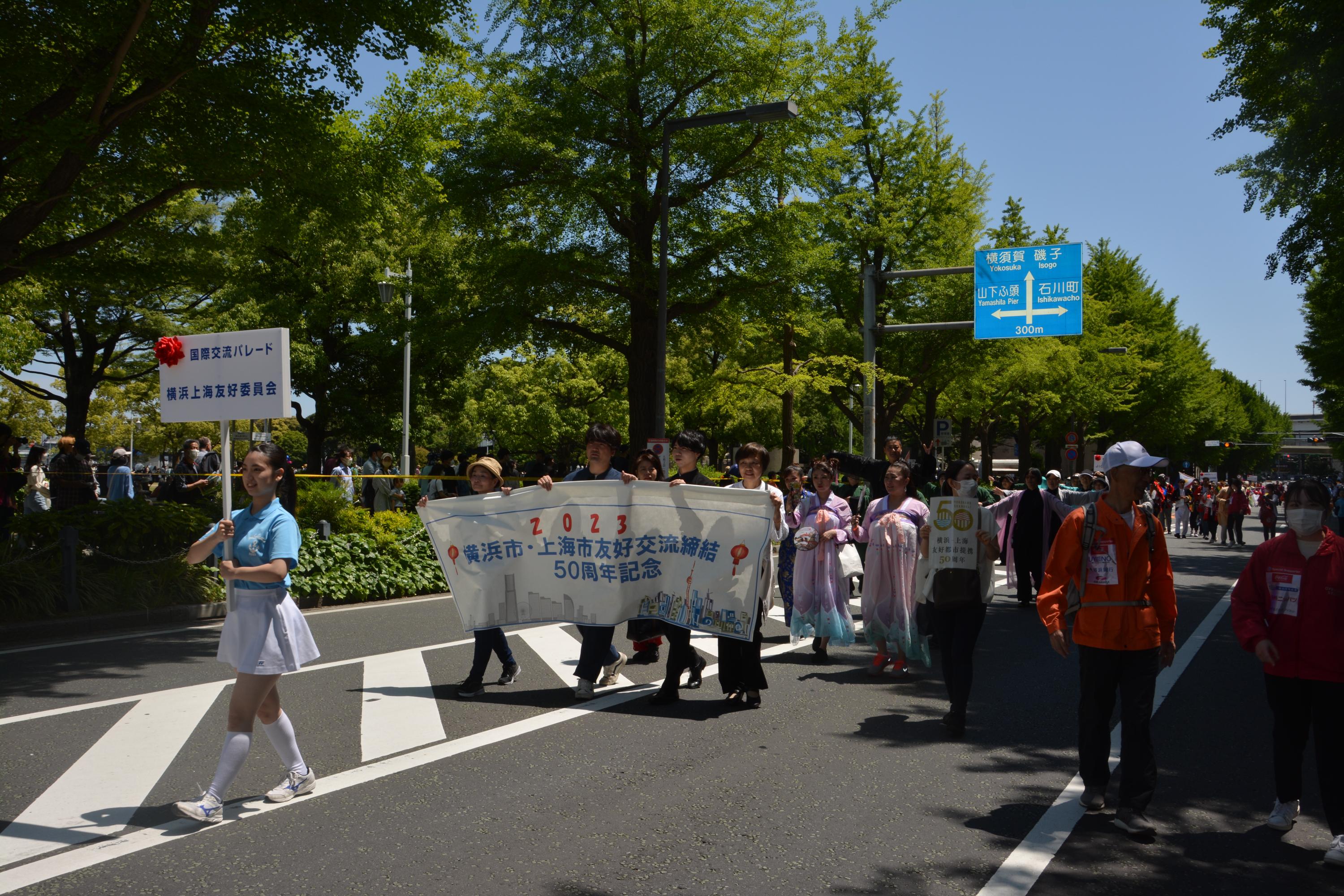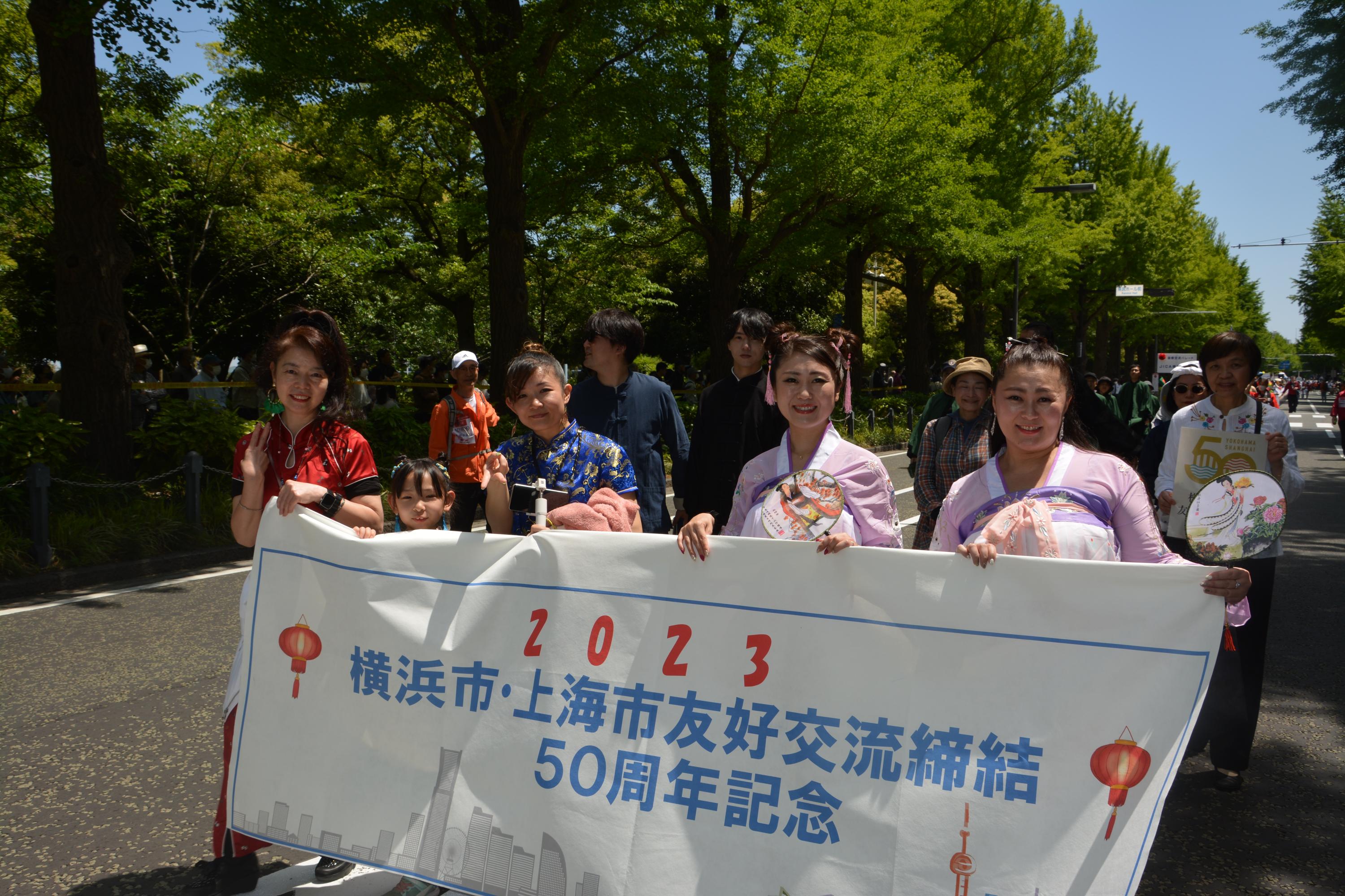 毎年恒例の横浜開港記念みなと祭のメインイベントである「ザよこはまパレード」に友好交流50周年を記念して友好委員会も参加しました。 コロナ明けのGWの中、天候にも恵まれ沿道にはたくさん人の中を楽しくパレードできました。 【日時】2023年5月3日(水・祝)     午前10時45分~ 【ルート】約1時間弱 山下公園→シルクセンター→横浜税関前→新港橋→赤レンガ→万国橋→馬車道→伊勢佐木町1~6丁目 【参加条件】 ・本会員であること ・チャイナ服または和装など仮装で参加 ・交代でプレートや50周年横断幕を  持ちながら参加できること 【参加費】無料 ザよこはまパレードの詳細については、 及び をご覧ください。  |